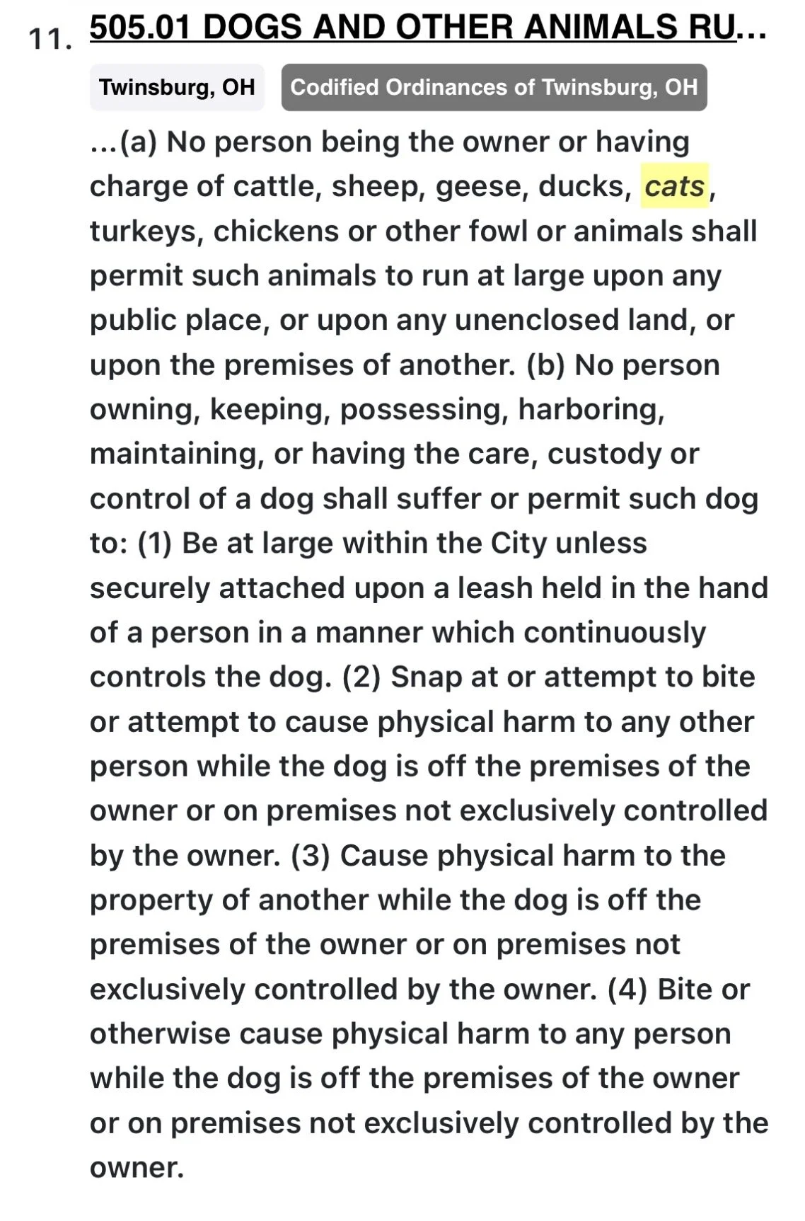 City Ordinance: A resident told me a neighbor leaves their cat outside.